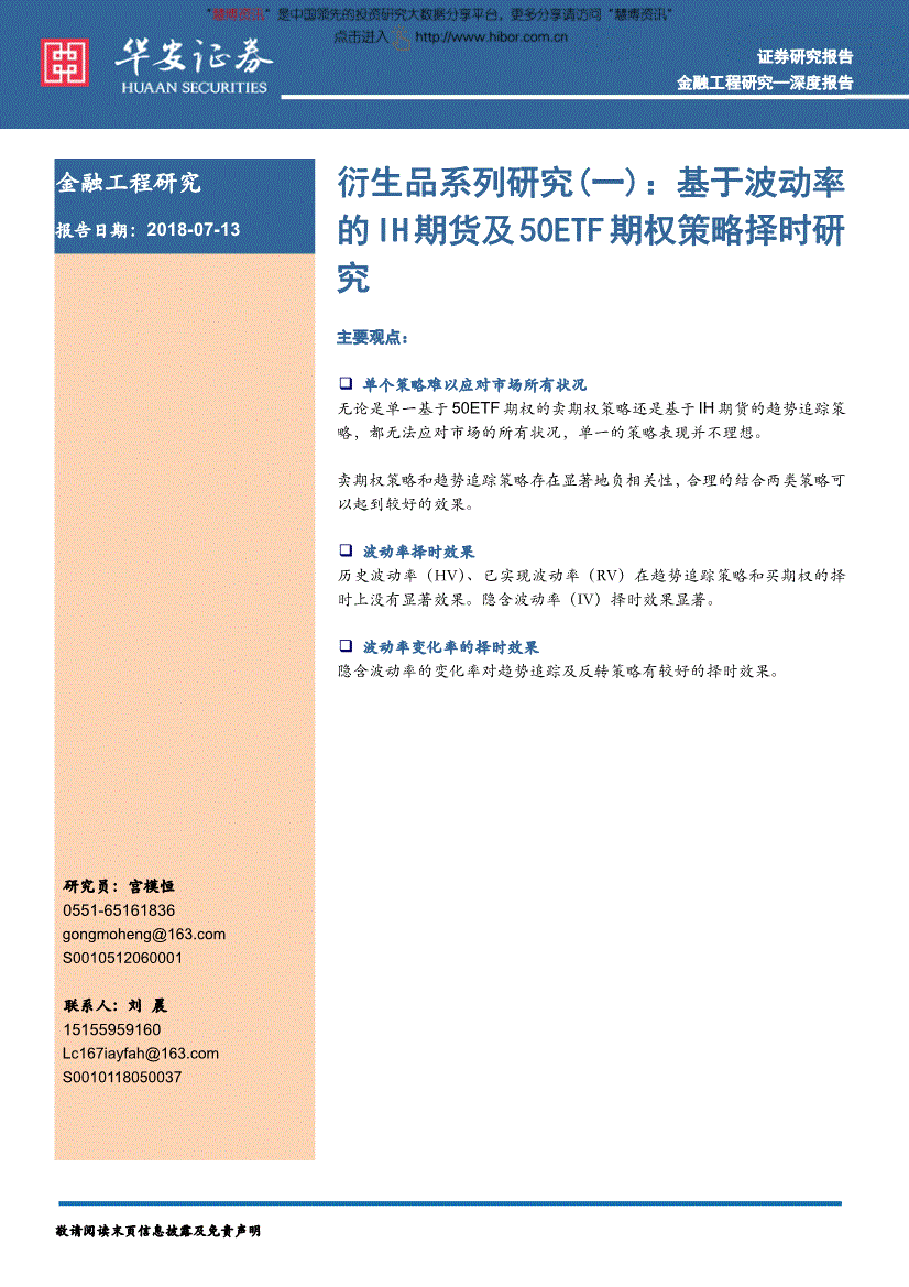 敬请阅读末页信息披露及免责声明证券研究报告金融工程研究—深度报告衍生品系列研究(一):基于波动率的IH期货及50ETF期权策略择时研究主要观点:单个策略难以应对市场所有状况无论是单一基于50ETF期权的卖期权策略还是基于IH期货的趋势追踪策略,都无法应对市场的所有状况,单一的策略表现并不理想。